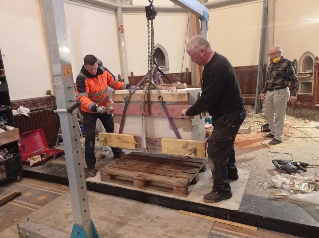 Des employés de l’entreprise Adekma se chargent de transporter l’autel de la chapelle de la Miséricorde pour l’emmener à l’église d’Asnières-sur-Vègre. © Ouest-France