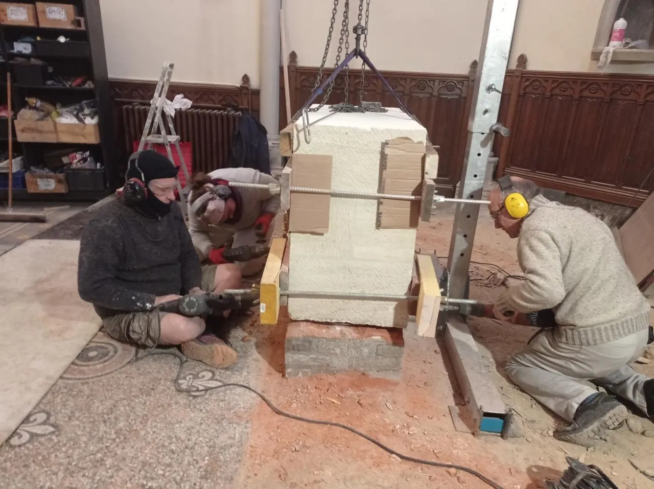 Nicolas Drouet (assis à gauche) et Élise Foucault s’attellent à desceller le socle de l’autel. Ouest-France