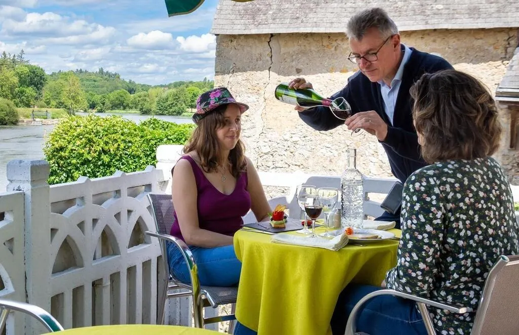 Dominique Bourneuf sur la terrasse avec deux clientes. © Petite Auberge