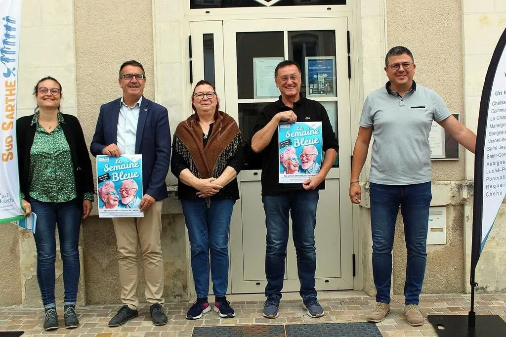 Les élus et Marie Canevet, directrice adjointe du centre social Equip’âges, ont présenté à la mairie de Pontvallain la Semaine bleue, une première pour la communauté de communes Sud Sarthe. © Le Maine Libre