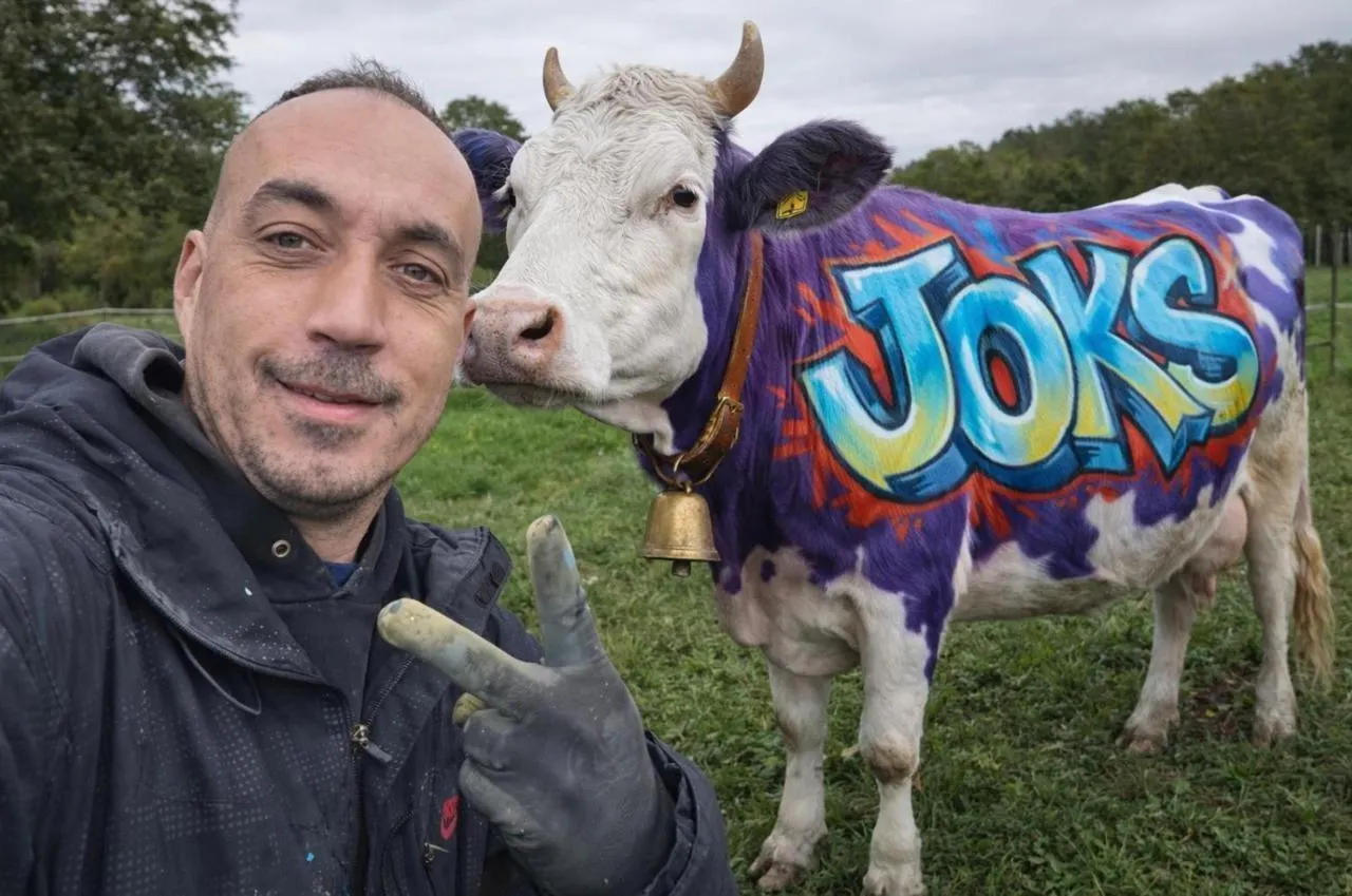 Le graffeur Eric Berthomé, alias Joks, a présenté sa dernière œuvre. Une magnifique vache Milka personnalisée. Mais il préfère anticiper les critiques : Pour les râleurs et la protection animale, ne vous inquiétez, pas j’ai utilisé des bombes à base d’eau. Aucun danger pour l’animal
