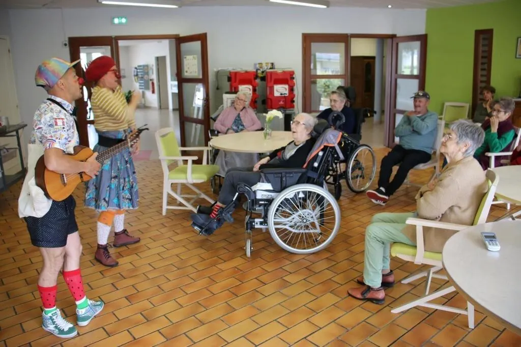 Les clowns Olga et Jimmy de la Compagnie des ailes du rire font sourire les résidents des Ehpad. Lundi 27 mai 2024, ils étaient aux Hespérides à Neufchâtel-en-Saosnois.