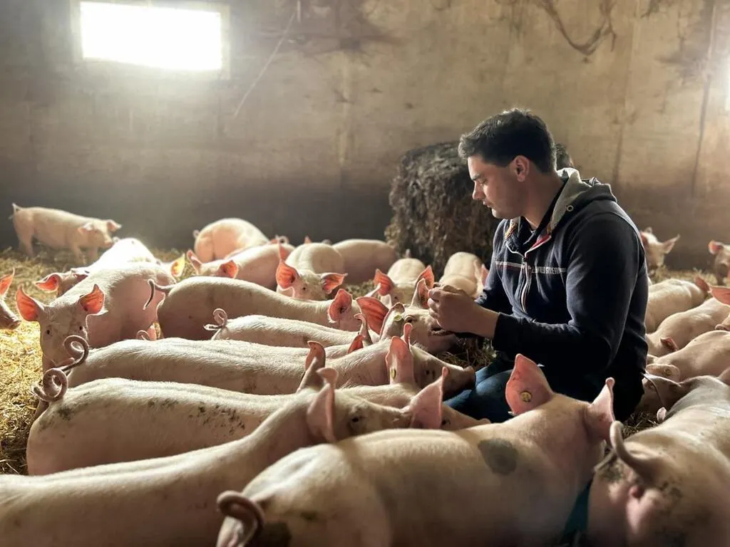 Romain Viot, entouré de ses cochons, à la ferme de la Drouerie de Trangé, près du Mans (Sarthe). © Ouest-France