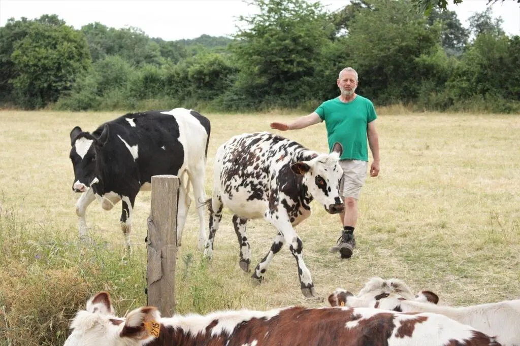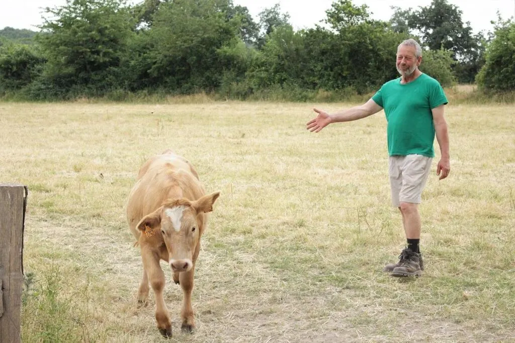 Arnaud Jeanson avec une de ses vaches, à Bazouges-Cré-sur-Loir, en juin 2023. © Le Maine Libre