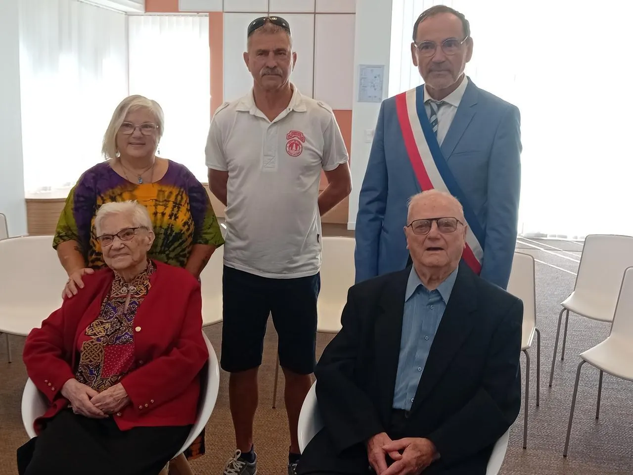 Léone Favery entourée de son mari Lucien, de ses deux enfants, Marie-Thérèse et Jean-Claude, ainsi que du maire. © Le Maine Libre