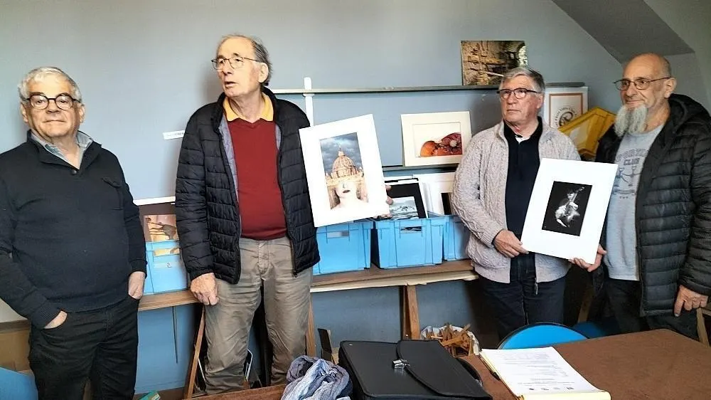 De gauche à droite : Francis Coulon, Marc Blachère (président du Photo vidéo club), Jean Veneau et Gérard Houillon. Ensemble, ils ont présenté le festival international de la photo, qui se déroulera du 3 au 11 mai 2025. © Le Maine Libre