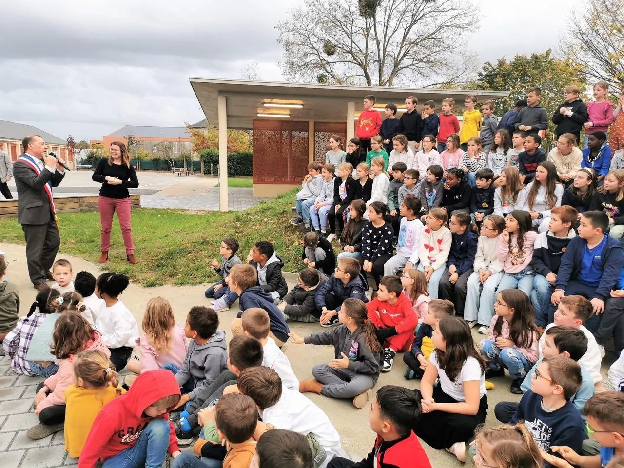 Les élèves ont été acteurs de l’inauguration de leur école rénovée. Ils ont chanté, posé des questions et offert mots et dessins au maire. © Le Maine Libre
