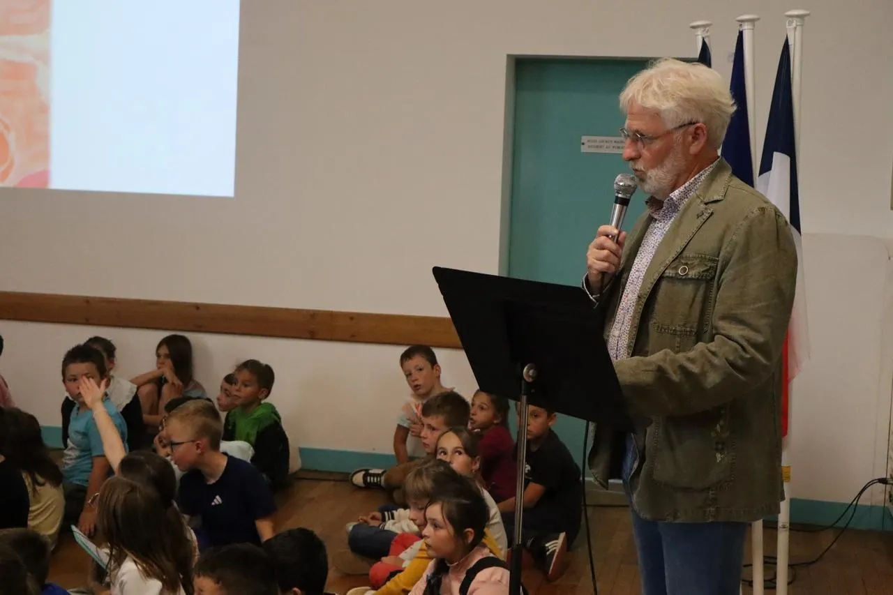 Lors de son allocution, le maire Maurice Vavasseur n’a pas manqué d’impliquer les enfants dans l’hommage à Robert Badinter. © Le Maine Libre