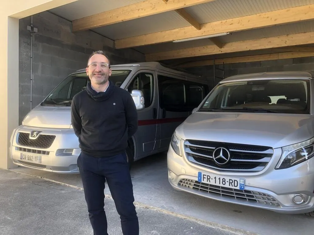 Benoit Triolet, directeur général des Pompes Funèbres Walle à La Flèche (Sarthe), devant le nouveau garage qui permet désormais d’abriter quatre véhicules. © Ouest-France