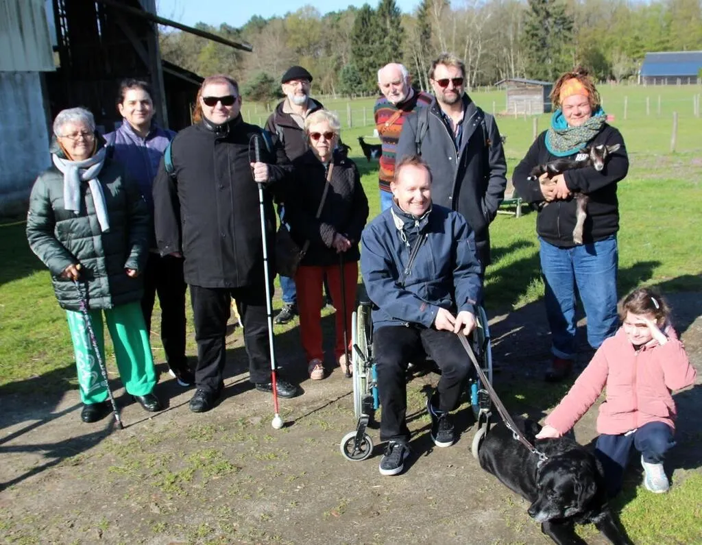 Le groupe de visiteurs présents samedi 8 avril 2023 à la ferme du Long Réage.Certains sont déficients visuels. © Le Maine Libre
