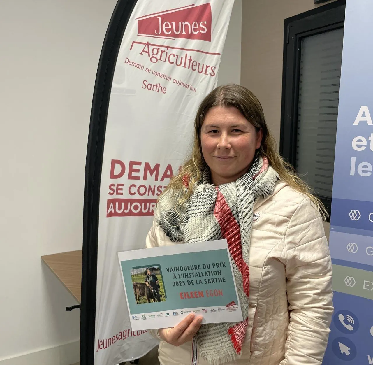 Eileen Egon, jeune éleveuse installée à Bazouges-Cré-sur-Loir (Sarthe), a remporté, jeudi 23 octobre 2025, le prix de l’installation en agriculture, attribué par les Jeunes agriculteurs de la Sarthe.