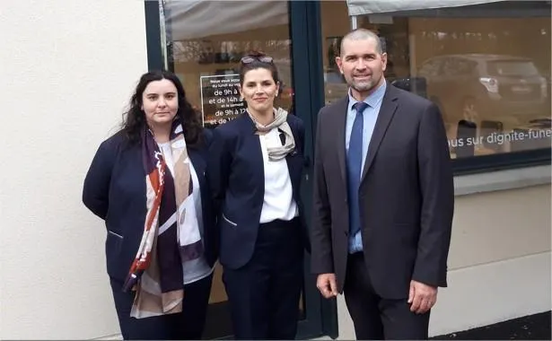 De g. à dr : Manon Poirier et Élodie Bourmault conseillères funéraires, Olivier Cherré directeur de territoire chez OGF. © Le Maine Libre