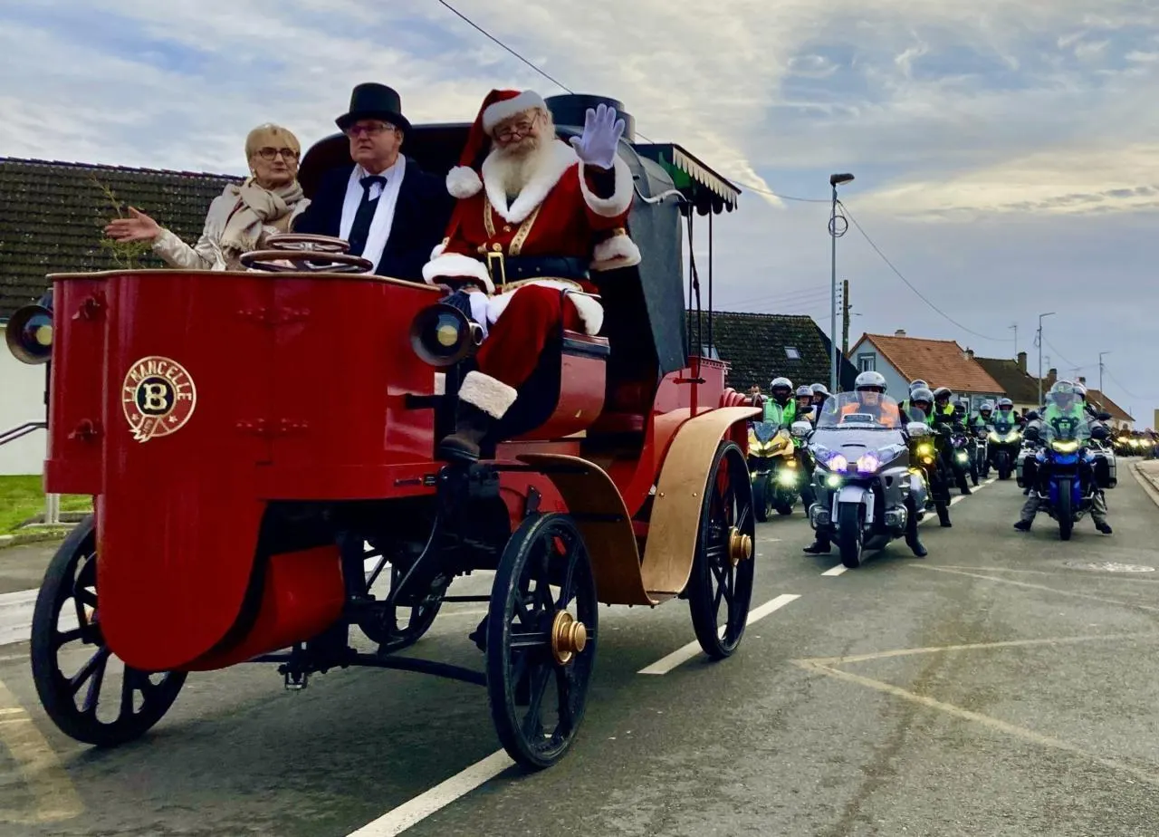 Samedi, la parade du Père Noël avait de quoi ravir les amateurs de mécanique : ils ont pu admirer la Mancelle, voiture à vapeur construite par Amédée Bollée, en 1878, ici rénovée en version électrique, escortée par plus de 200 motards de l’association Casque d’or de Saint-Gervais-en-Belin, dont la virée était organisée au profit du Téléthon. © Ouest-France