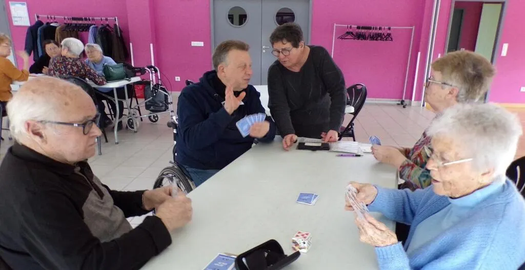 En attendant, les premiers participants ont pris plaisir à jouer ensemble, sans se connaître pour certains. Les bénévoles étaient présents pour aider des participants à jouer. Beaucoup étaient impressionnés par la vivacité d’esprit de Renée qui aura « 99 ans au mois de septembre ». Elle n’a pas sa pareille pour compter les points des cartes à l’issue de la partie, assurer la distribution… Elle s’aide d’un gros dé sur lequel sont apposées les quatre couleurs des cartes pour ne pas perdre de vue l’atout demandé. Elle chuchote à l’oreille : « A l’école j’étais meilleure en calcul mental qu’en orthographe ».