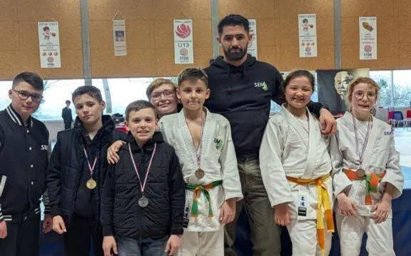 Les huit benjamins médaillés entourent leur entraîneur, Amaury Vrignaud. © SEMJJ