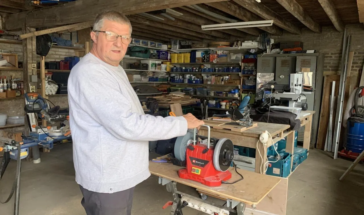 Dans son atelier, Claude Cogné s’affaire, sur son touret à meuler, à affûter les ciseaux de la coiffeuse. © Ouest-France