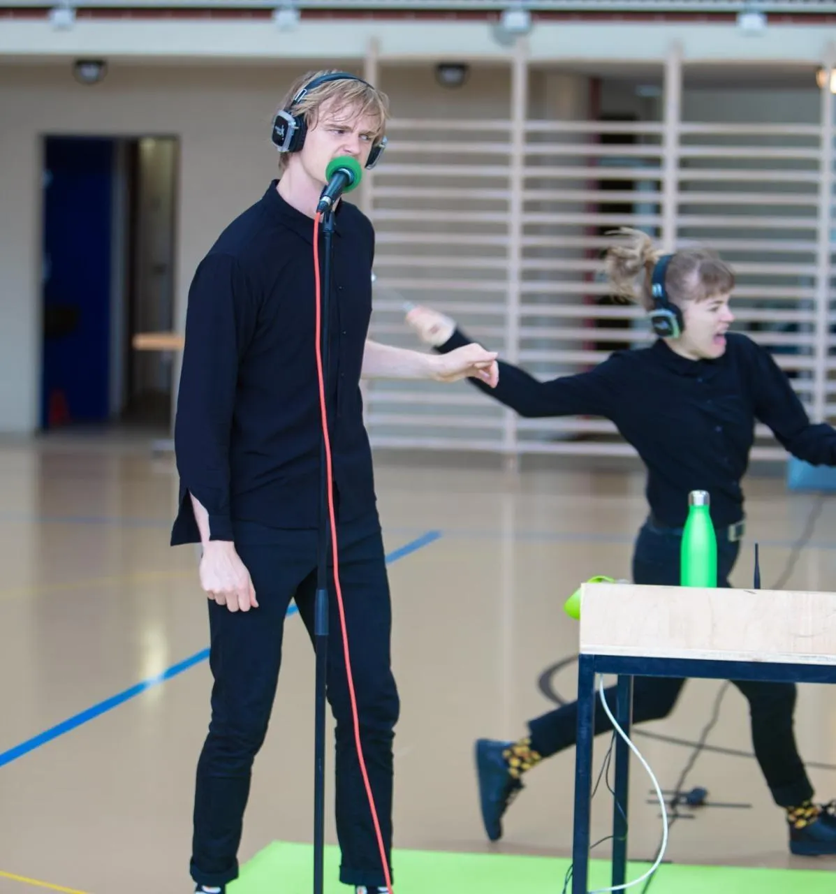 Face aux spectateurs, un comédien, une bruitiste et des objets : micros, bouteille d’eau, ustensiles de cuisine ou encore deux noix de coco. Il ne leur en faut pas plus pour fabriquer, sous les yeux du public, un véritable « théâtre de l’oreille », où les sons et l’imaginaire occupent une place centrale.