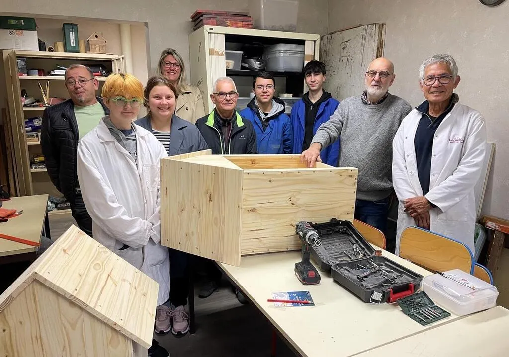 Chiara, Capucine, Sloane et Lucas, entourés par Anthony Dubois, l’agent référent des chantiers Argent de poche, Esther Lebouleux, ajointe au maire, et les bénévoles de l’atelier menuiserie d’Alpha Sablé, vendredi 25 octobre 2024. © Ouest-France