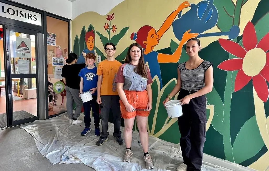 L’artiste mancelle Alice Hervé (au centre) avait encadré quatre jeunes en juillet 2024 pour un chantier Argent de poche, à l’accueil de loisirs Bouskidou, à Sablé-sur-Sarthe. © Archives Ouest-France