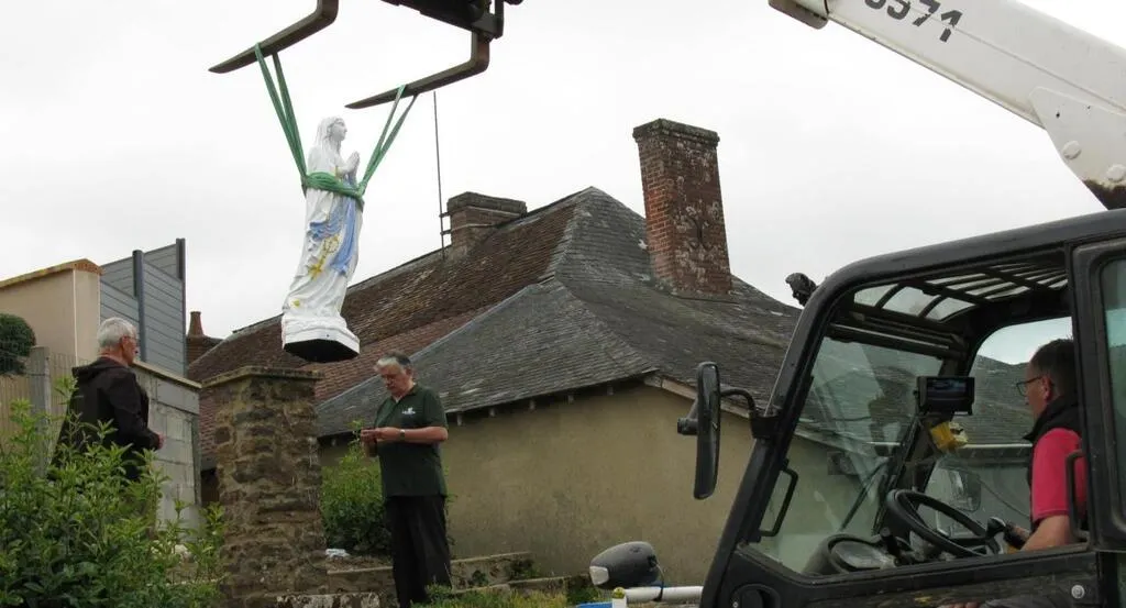 La statue de Notre-Dame-de-Lourdes, symbole protecteur de la commune, a été restaurée et réinstallée au lieu-dit La Belle-Croix à Chaufour-Notre-Dame (Sarthe).