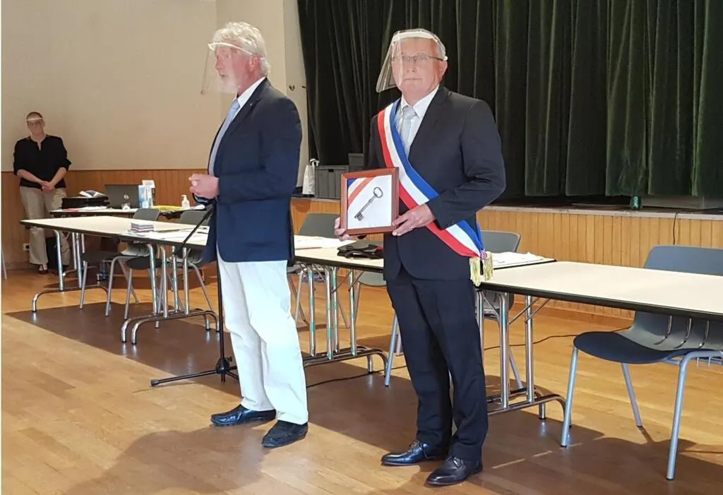 Michel Landais (à gauche) maire sortant a transmis la clef de la ville à Jannick Niel, nouveau maire de Cherré-Au (à droite). © Le Maine Libre