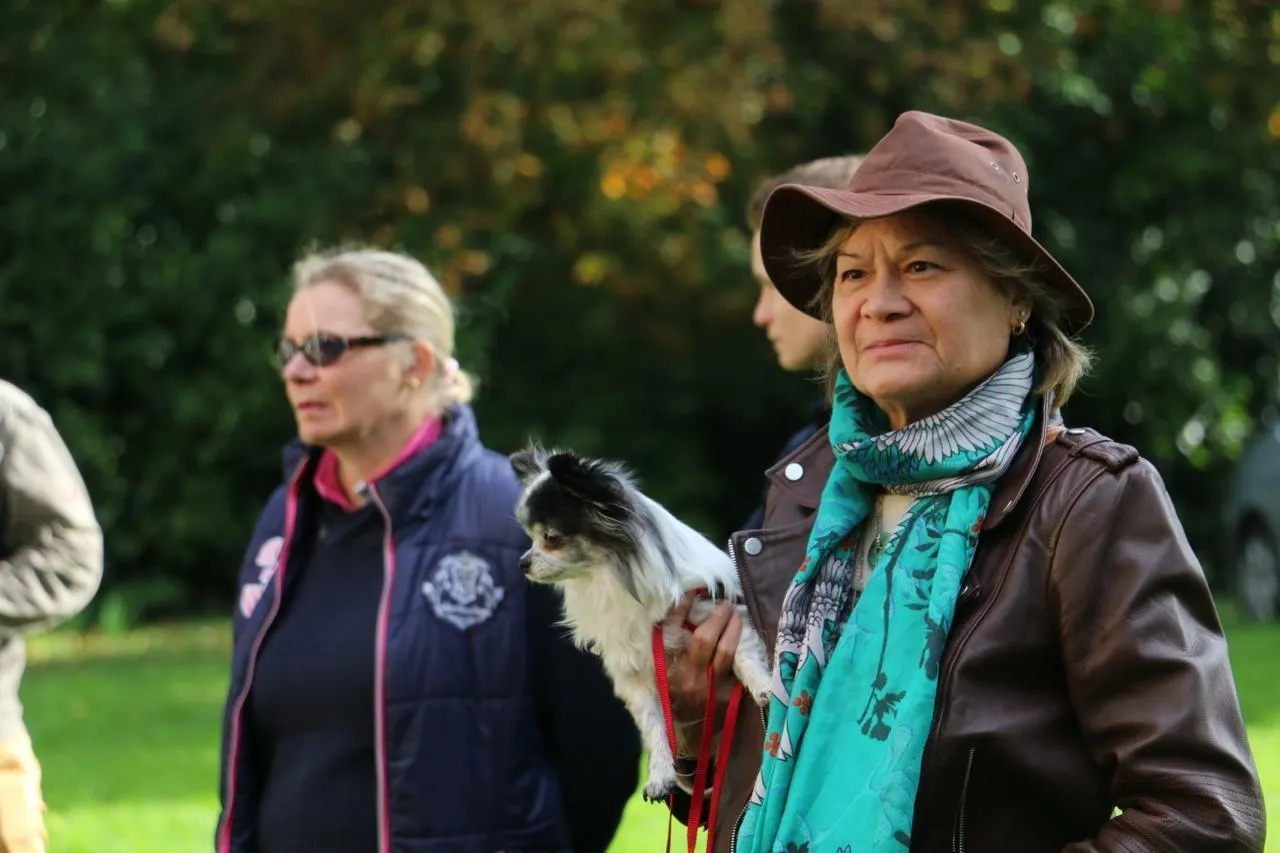 Béatrice est venue faire bénir sa chienne d’un an et demi, Virgule, ce samedi 4 octobre 2025 dans le jardin du presbytère de l’église Sainte-Colombe, à La Flèche (Sarthe). © Ouest-France