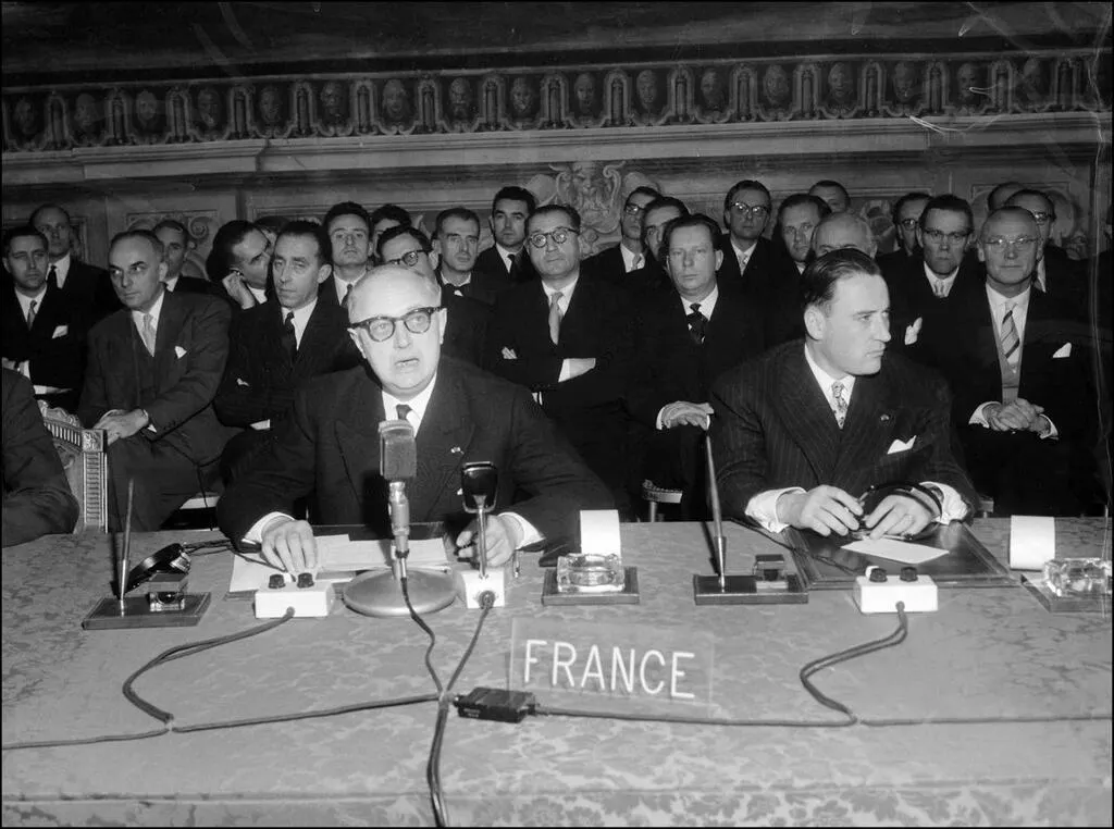 Christian Pineau (à gauche) et Maurice Faure, le 25 mars 1957 à Rome. Au nom de la France, le ministre et son secrétaire d’Etat signent les traités instituant la Communauté Economique Européenne (CEE) et la Communauté Européenne de l'Energie atomique (EURATOM). © AFP