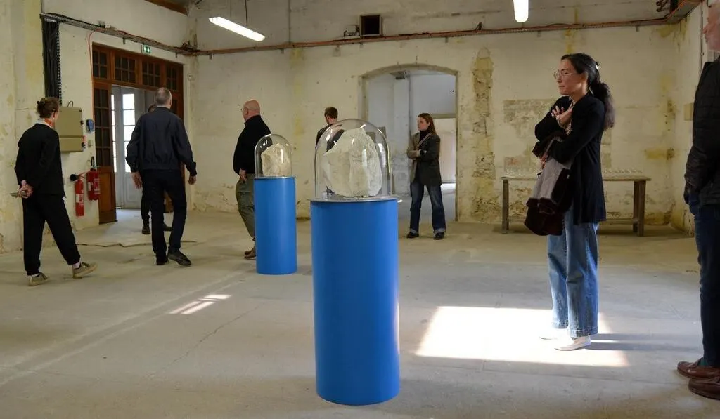 Roches naturelles brûlées à 900 °C ont été déposées délicatement sous des cloches en verre étanches à l’air, elles-mêmes portées par des piédestaux. Ouest-France