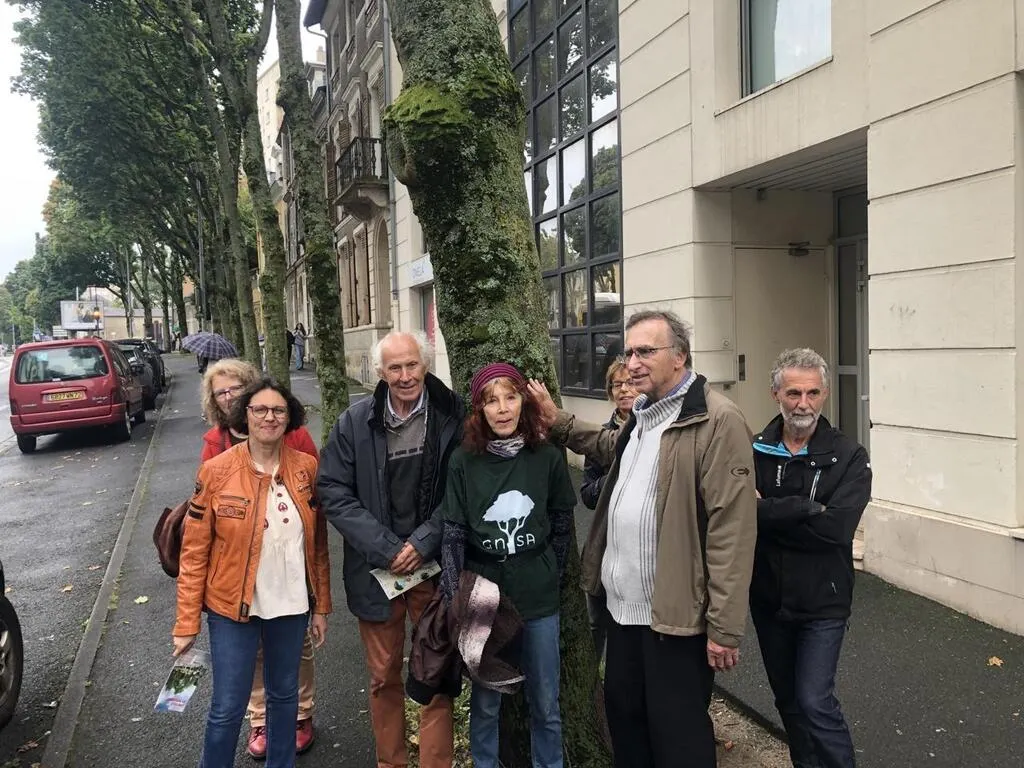 Louis Vallin et Georges Feterman, vice-président et président de l’association A.R.B.R.E.S. Remarquables, entourés de membres du collectif 200 arbres Bollée. © Le Maine Libre