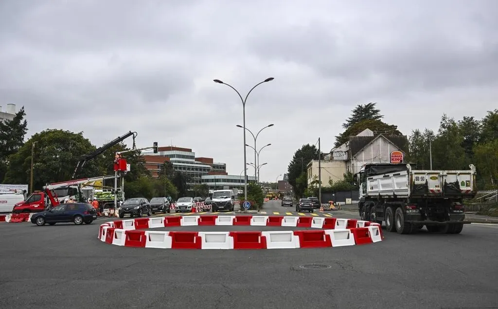Un giratoire est installé depuis ce jeudi 3 octobre dans le carrefour dit des Quatre-Pentes, entre l’avenue Bollée et la rocade (en contrebas du Burger King). © Le Maine Libre – Denis LAMBERT