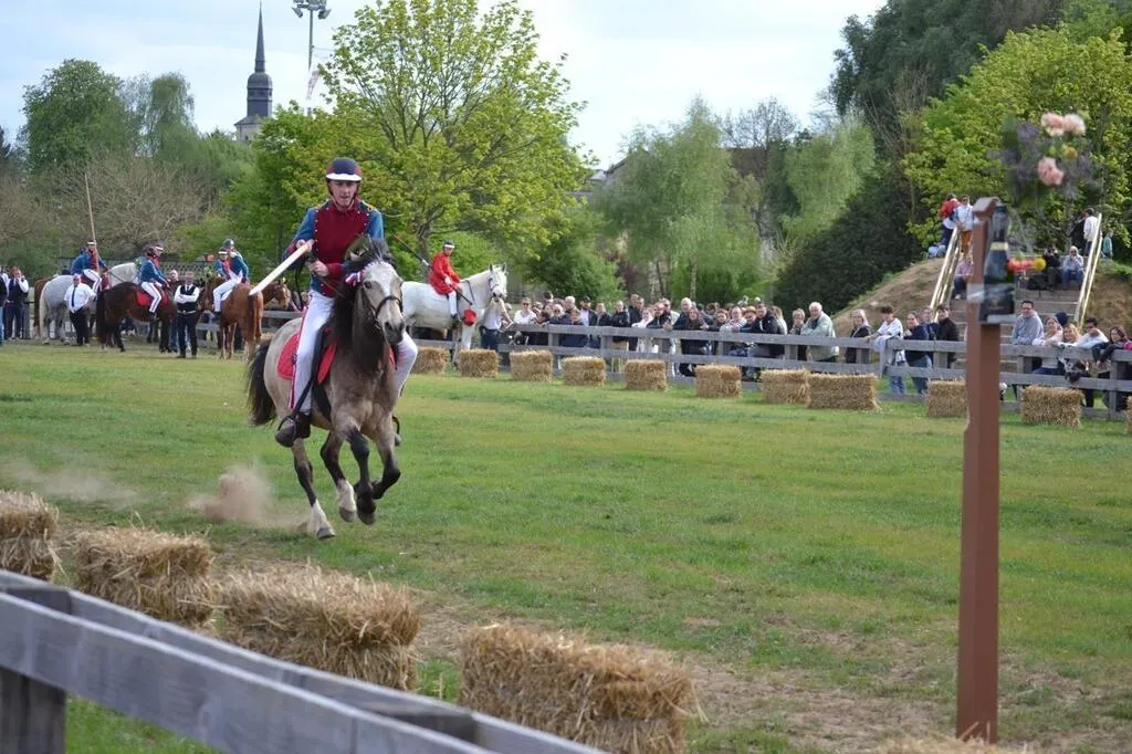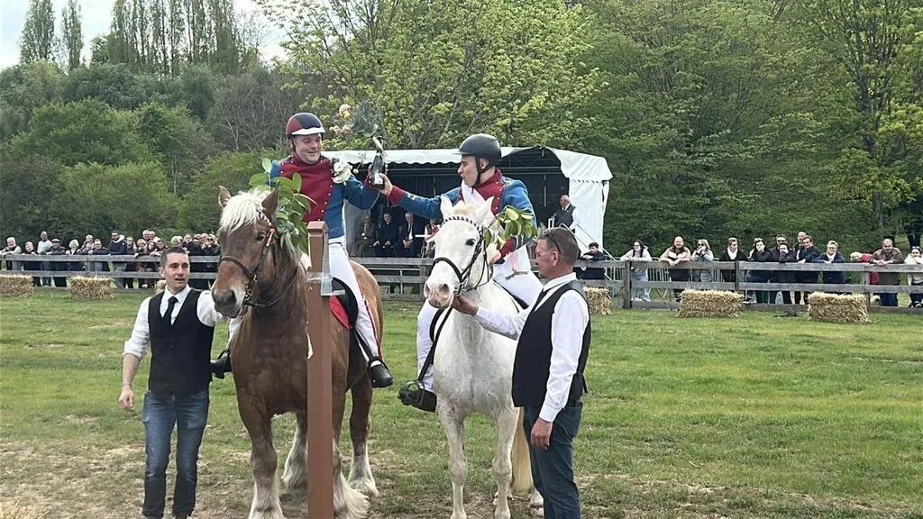 Sous la cavalcade des chevaux, la poussière du parc de l’Huisne s’est levée, ce dimanche 13 avril 2025. Autour du terrain, des centaines de personnes étaient massées dès 15 h. Elles attendaient avec impatience le lancement du bris des lances, le spectacle de la Fête des lances de Champagné (Sarthe).
