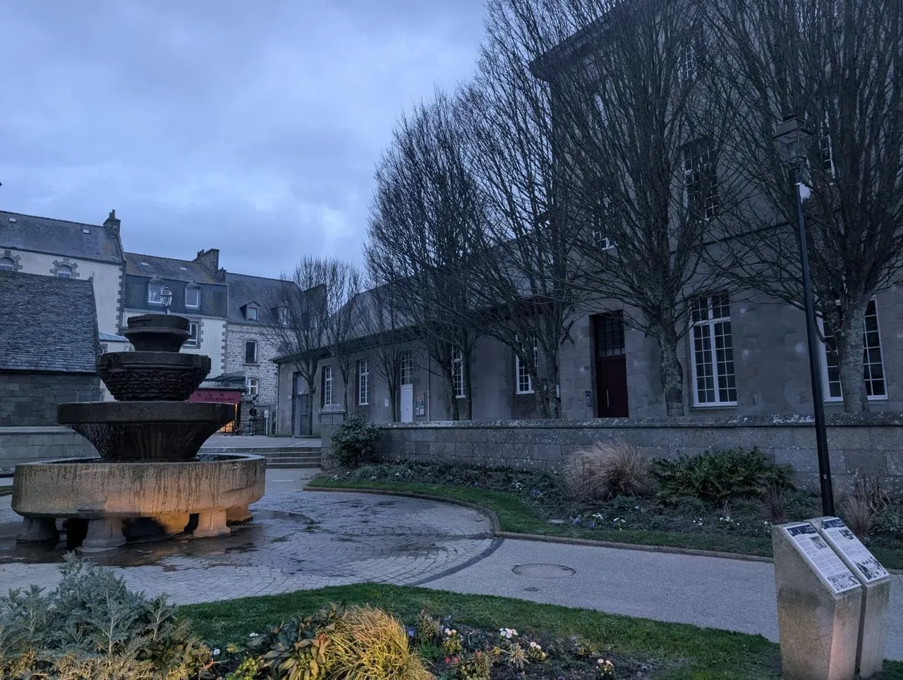 C’est ici, près de la fontaine de la place Michel-Colombe à Saint-Pol-de-Léon (Finistère), que plusieurs personnes ont été blessées par des tirs à la carabine jeudi 26 février 2026, vers 16 h 30. © Ouest-France