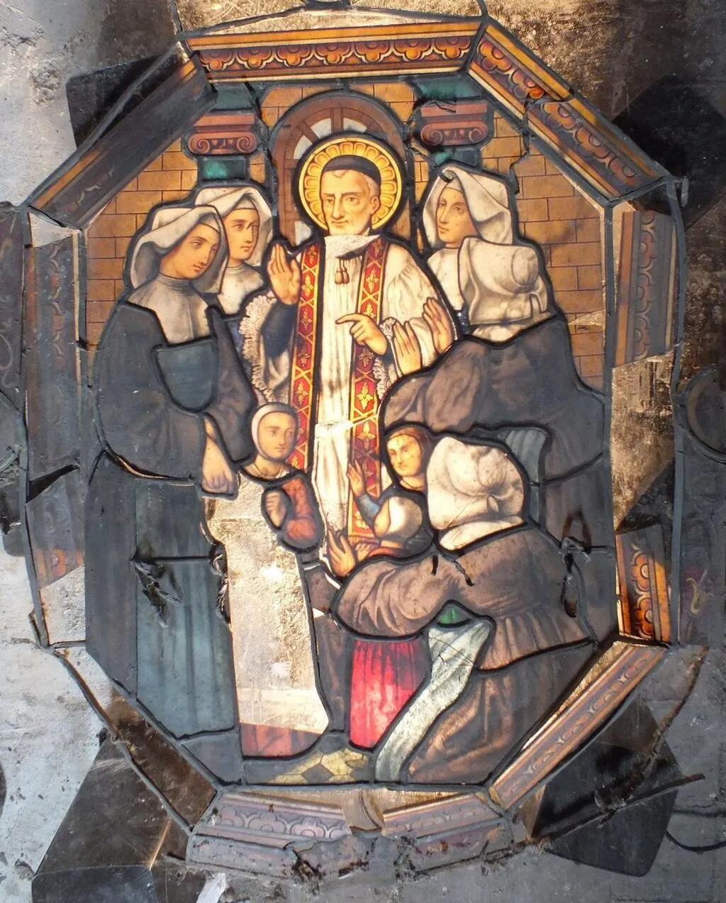 On voit sur ce vitrail, saint Vincent de Paul instituant l’ordre des sÅ“urs de Charité. Cette partie du vitrail est remarquable par la netteté des détails et par la pureté de la composition. © Le Maine Libre