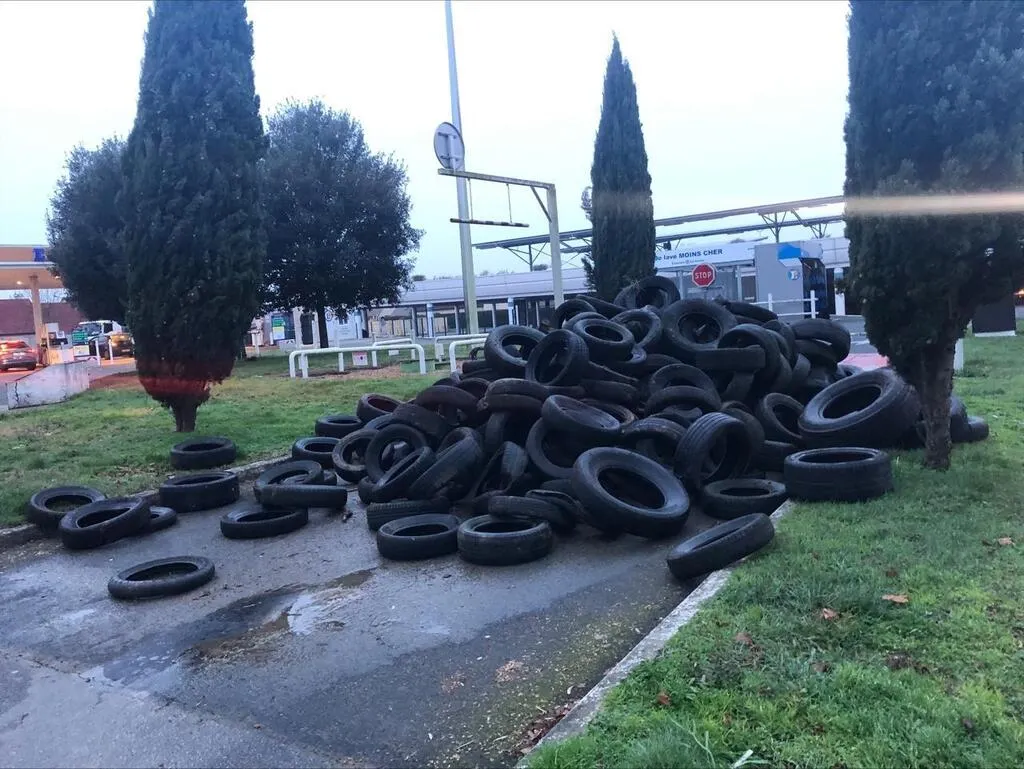 Un amoncellement de palette, fumier et détritus a été déposé devant les portes automatiques du centre commercial et l’accès au parking par la D323 a été barré par de nombreux pneus.