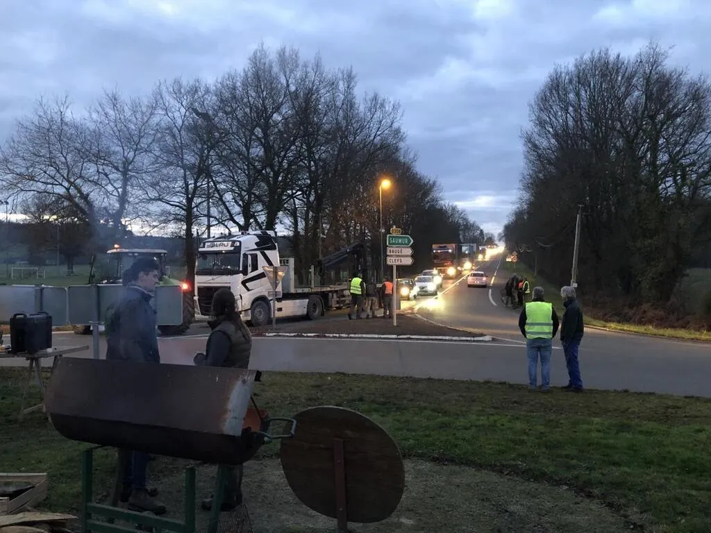 Des agriculteurs du sud de la Sarthe bloquent le rond-point de la Pépinière à La Flèche. Ouest-France