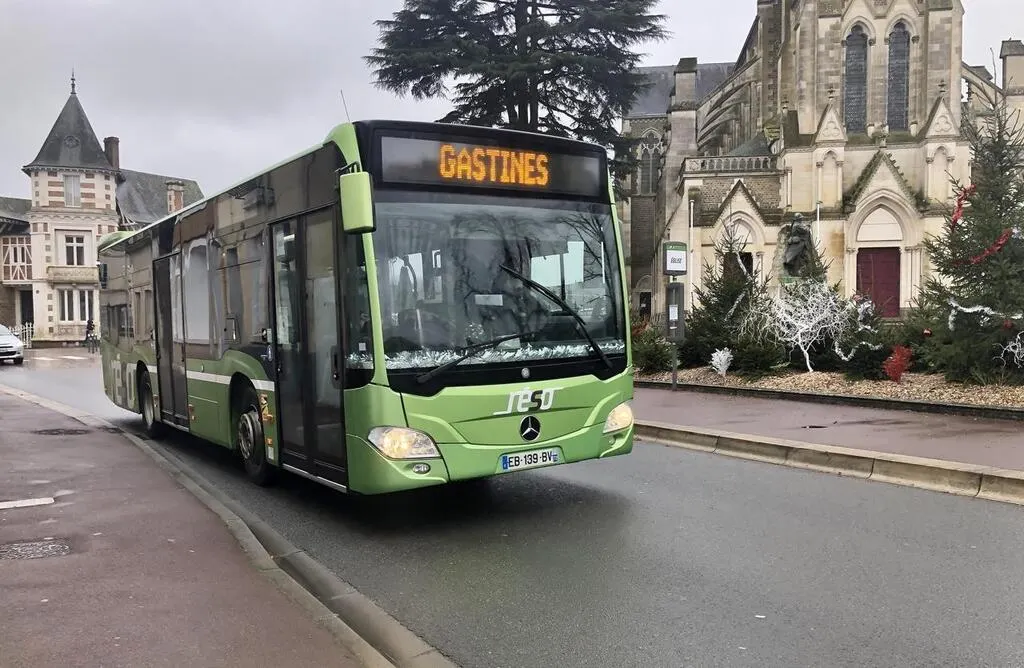 Un bus Réso passant devant l’église à Sablé-sur-Sarthe, en décembre 2021. © Archives Ouest-France