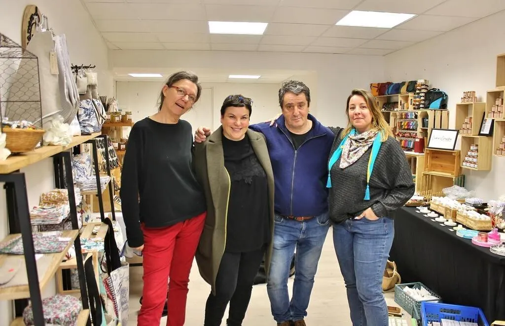 Fabienne Goyeau (à gauche), avec une partie des artisans qui exposeront dans la nouvelle boutique éphémère : Delphine Malin (Créations Delphine M), Éric Chapron (Les 3D Mans) et Chloé Chesnel (Lune et Louise) © Ouest-France