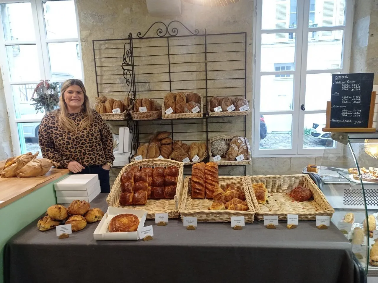 Clémence Beuvier présente les pains et productions boulangères d’Antoine, son mari,dans leur boutique du Vieux-Mans. © Ouest-France