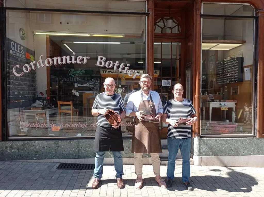 Thibault d’Echallens, nouveau gérant de la cordonnerie ancestrale, entouré de Philippe Lecomte (à droite) et d’Olivier Pancher qui prennent leur retraite. © Ouest-France