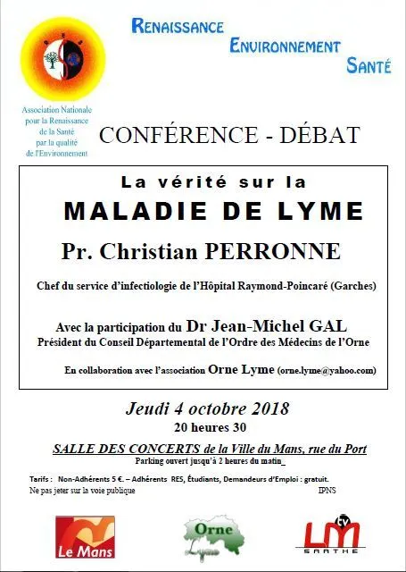 Merci de bien vouloir faire paraitre dans votre prochain bulletin la Conférence/Débat sur le Thème " la vérité sur la maladie de Lyme " avec le Pr Christian PERRONNE, le Jeudi 4 octobre à la salle des concerts du MANS, rue du port à 20 H 30.