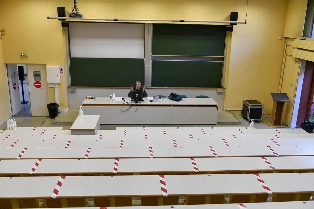 Confinement. Le Mans : un prof devant un amphi vide, mais des étudiants bien présents... |