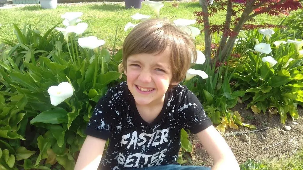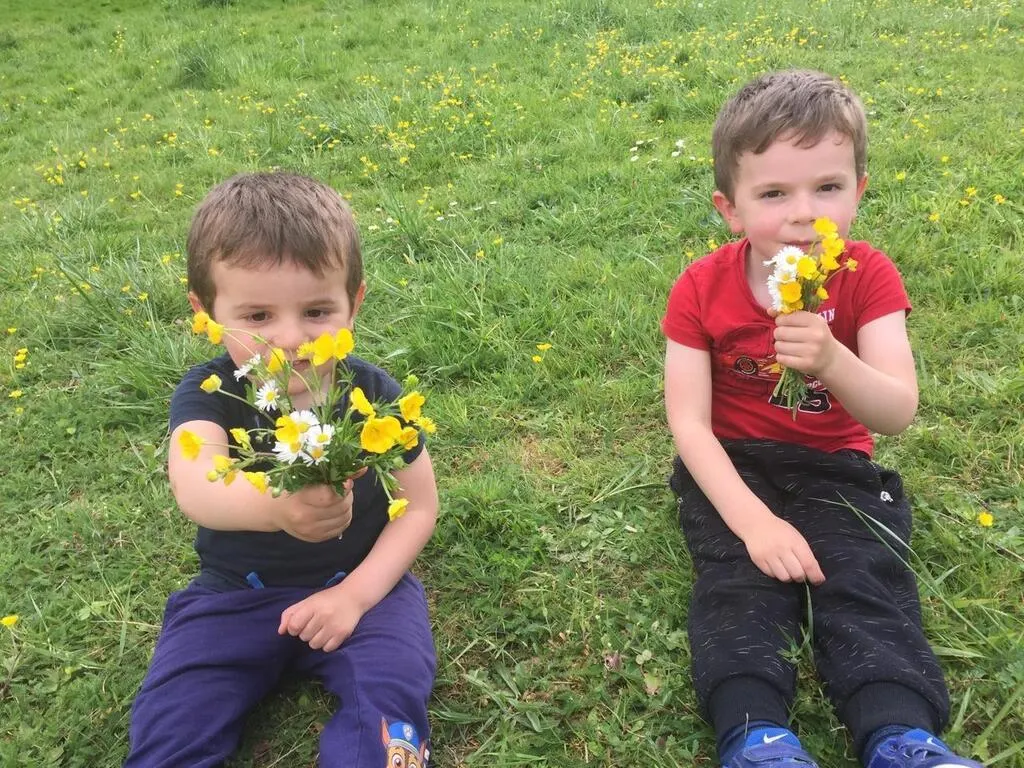 Yasin, 4 ans, et Ali, 2 ans, adressent un message avec des fleurs: « Coucou papy Jean et mamie Madeleine. Ces quelques fleurs pour dire que vous nous manquez beaucoup. On a hâte de vous revoir vite. Gros bisous à papy, mamie et tata ».