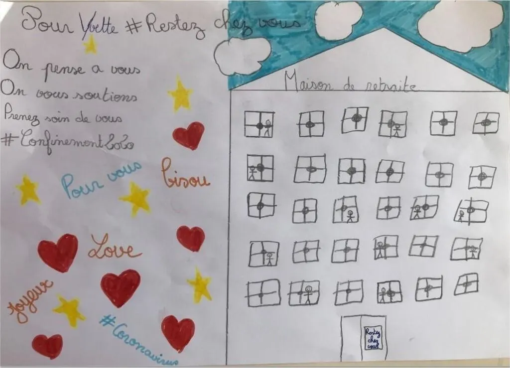 Forcément, le monde médical a largement inspiré les jeunes artistes (notamment le personnel et les résidents des maisons de retraite), à force de seringues, de masques et d’ambulances. Le message « Restez chez vous » a largement été relayé sur ces dessins.