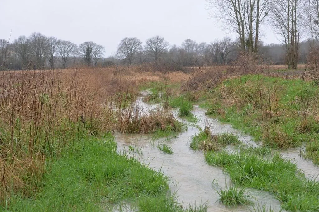 Le début de la portion du CR 20 incriminée, au lieu-dit Le Grand-Aunay, le 22 février. À partir des arbres à droite, le dénivelé augmente et le courant aussi. © Le Maine Libre