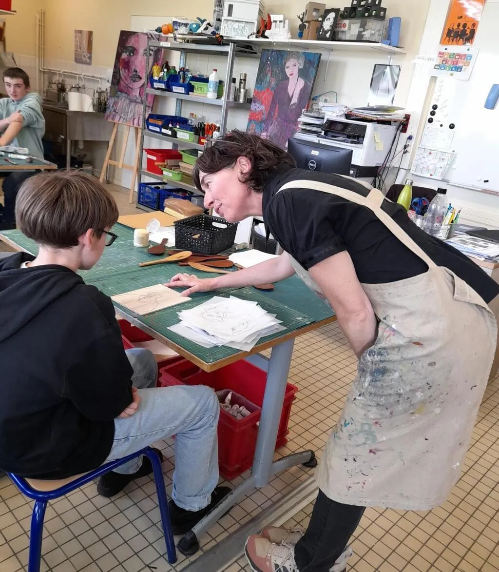 Cette Sarthoise qui a suivi des cours d’estampes aux Beaux-Arts a tout d’abord présenté son travail aux collégiens où la plupart des ses œuvres représentent des personnages féminins parfois littéraires ou mythologiques. Puis, elle a proposé des ateliers de création permettant aux jeunes de s’initier à la technique de la gravure sur bois. Chacun a pu réaliser une estampe avec les conseils de l’artiste et ainsi découvrir les difficultés d’une création et ses contraintes techniques.