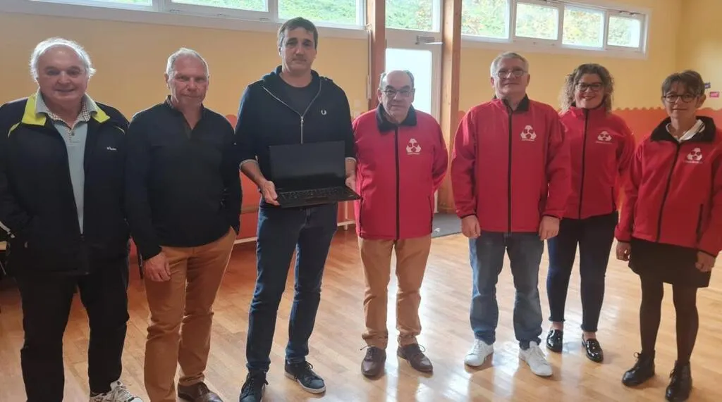Samedi dernier, a eu lieu la remise d’un ordinateur portable au club de tennis, en présence de représentants du club et du Crédit Mutuel. Le club, présidé par Thierry Charpentier (ordinateur en mains) et qui compte 160 membres, en avait fait la demande afin de remplacer son ordinateur obsolète. C’est le Crédit Mutuel, via l’opération Créavenir, qui a offert ce nouvel ordinateur. © Ouest-France