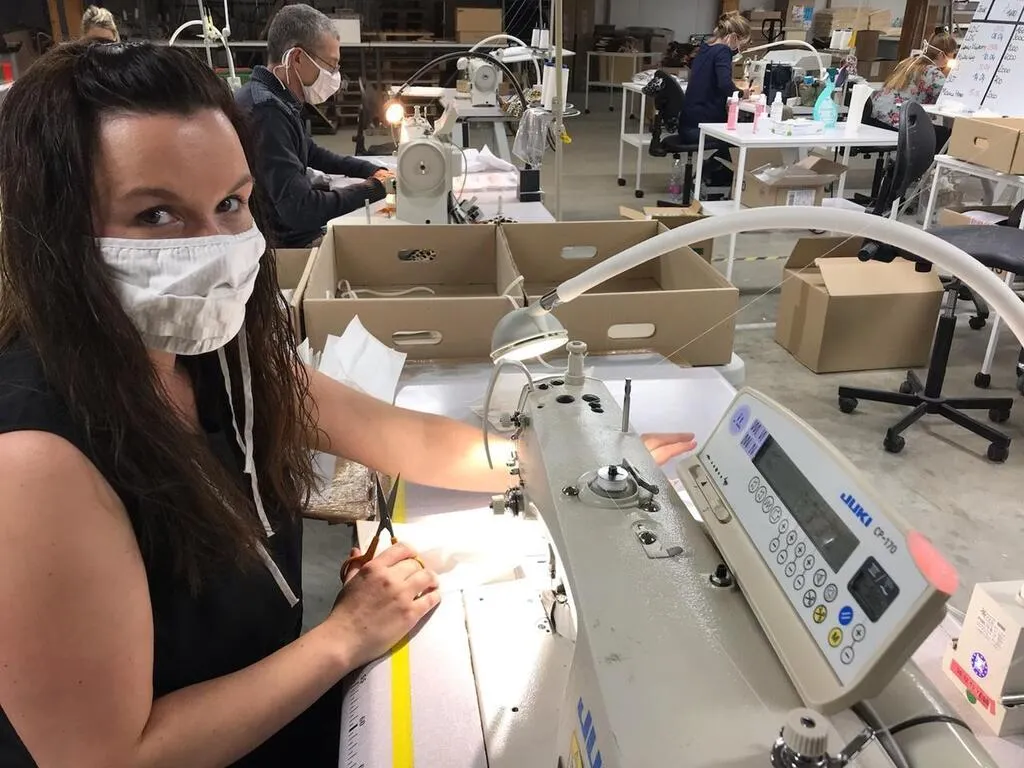 Les salariés équipés de gels hydroalcooliques fabriquent leurs masques sur des machines régulièrement désinfectées. © Femilux