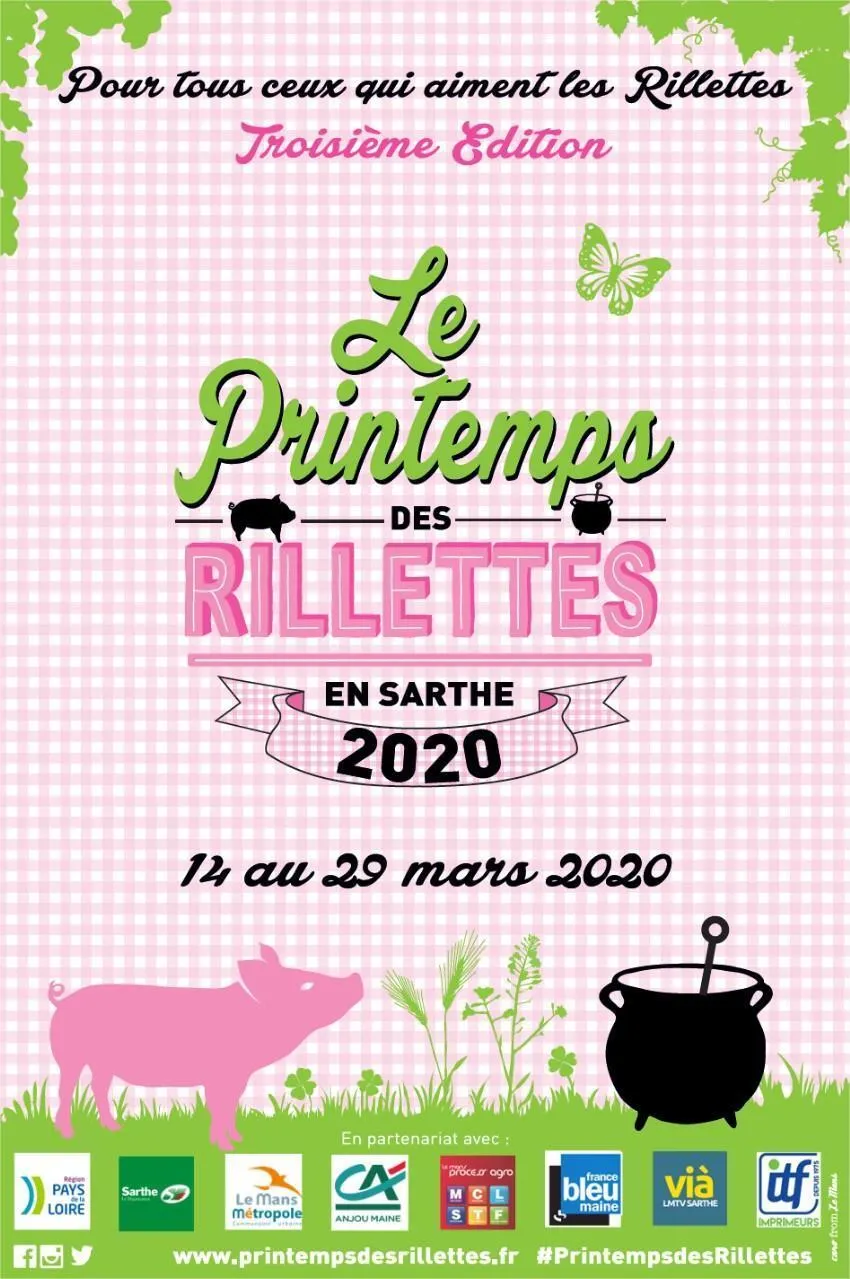 Les commerces de bouche à travers les sièclesdans la Cité Plantagenêt avec le Pays du Mans, samedi 21 mars - Concours de recettes avec des rillettes : transféré au Château de Bresteau à Beillé. Cet événement ne sera pas ouvert au public - Jeu web les Ambassadeurs : montée en puissance du jeu qui va servir de colonne vertébrale au nouveau Printemps des rillettes 2020, avec les mascottes Arty et RillettMan - Connerré en fête (21 mars) et La Ferté-Bernard en fête (21-22 mars), réduits aux événements privés - Théâtre