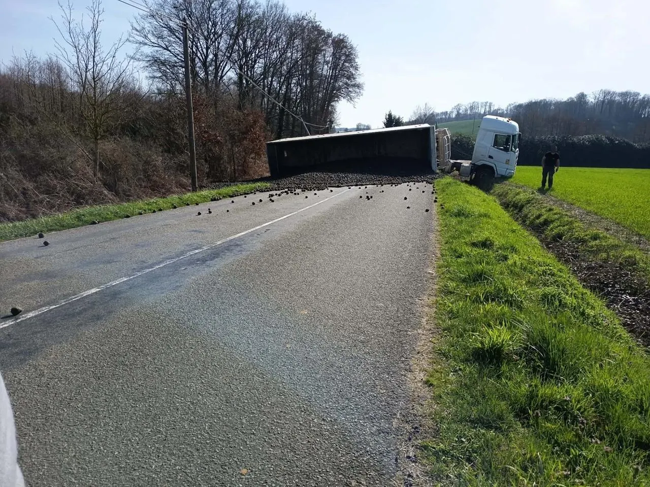 L’image est spectaculaire. La remorque d’un poids lourd chargé de betteraves s’est littéralement couchée sur la chaussée.
