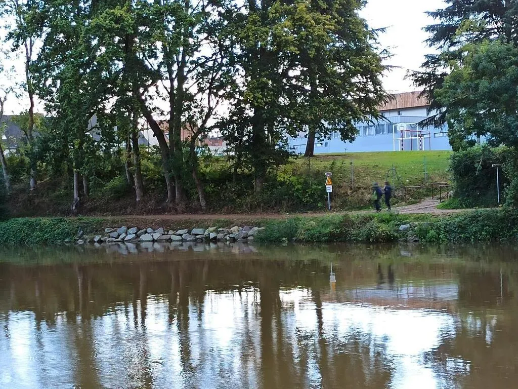 Rive droite, la passerelle débutera près du terrain de tennis du gymnase de la Madeleine, en haut à gauche des barrières du chemin. © Ouest-France
